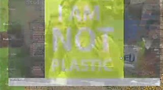 What you see above right is what happens when you inadvertently hit the pause button while reviewing a tape of the Principal's Instructional Show Case which is part of every Bloomfield Hills School Board meeting. The student in the center is speaking at podium. The green tint and word "I am not plastic" come from an refillable water bottle she designed in a campaign to stamp out plastic water bottles. That image is is superimosed on the campaign's web site. In the lower left is a bit of a poster from the movie Tapped which the student screened as fund raiser. Her presentation and that of other students will be discussed in our neext post titled Multi Media in the Classroom of Model High School. Bloomfield Hills School Series Part 1